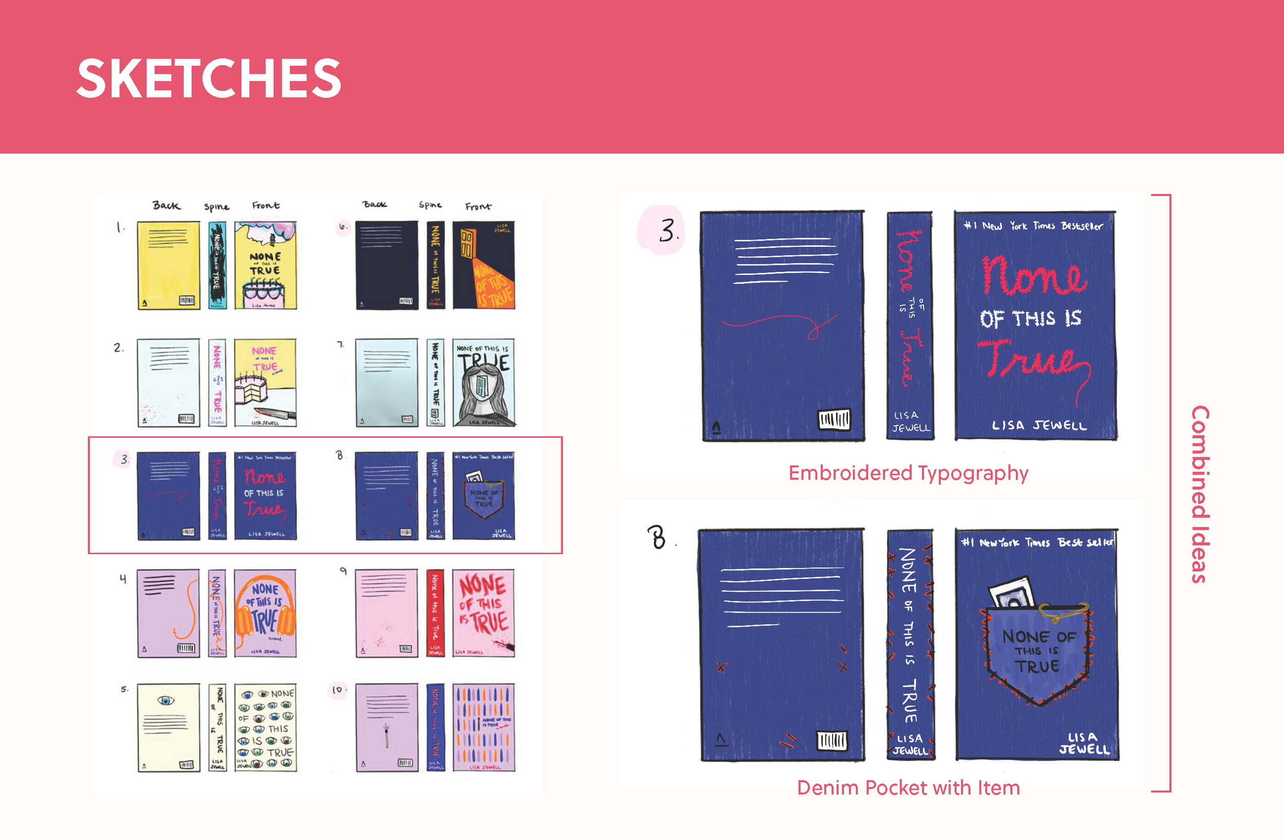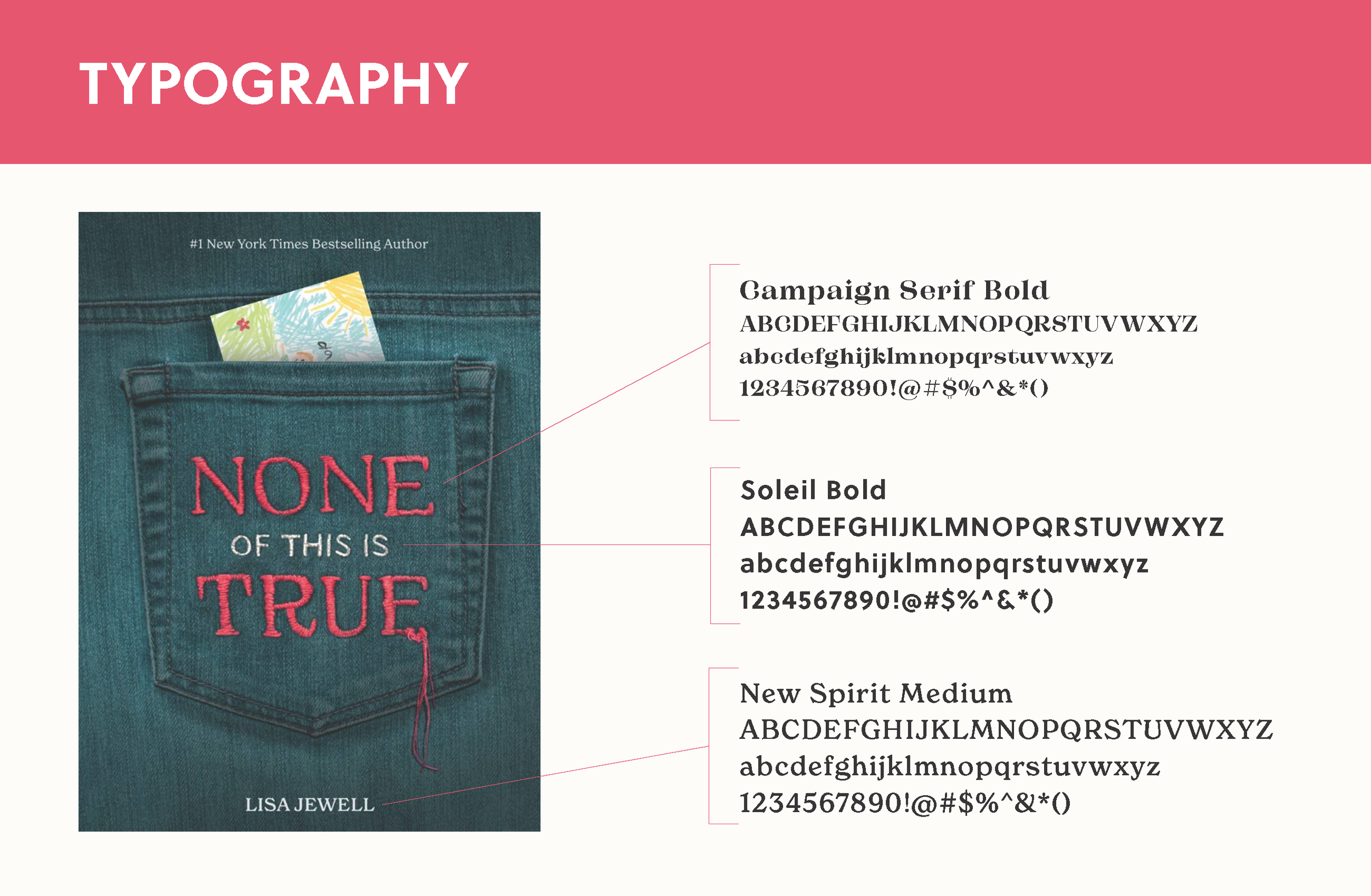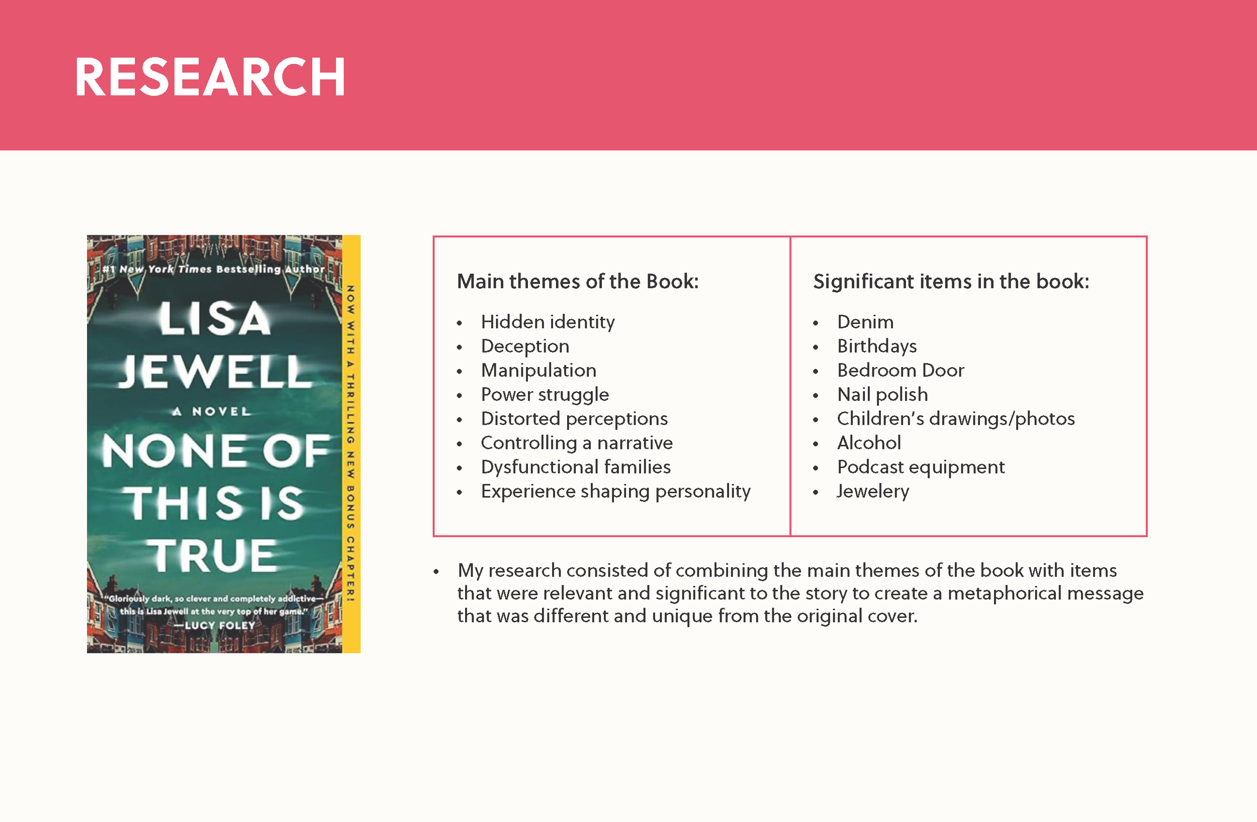 None of This is True by Lisa Jewell is a psychological thriller detailing an odd connection between two mothers, one a famous podcaster, and the other, an average suburban wife. My design focused on the main character’s obsession with wearing denim fabric. I hand-embroidered the type with the end unraveling, similar to the character’s innocent facade unraveling throughout the book. The removable bookmark of a child’s drawing in the pocket allows for user interaction and symbolizes the character’s desire to take things that don’t belong to her.