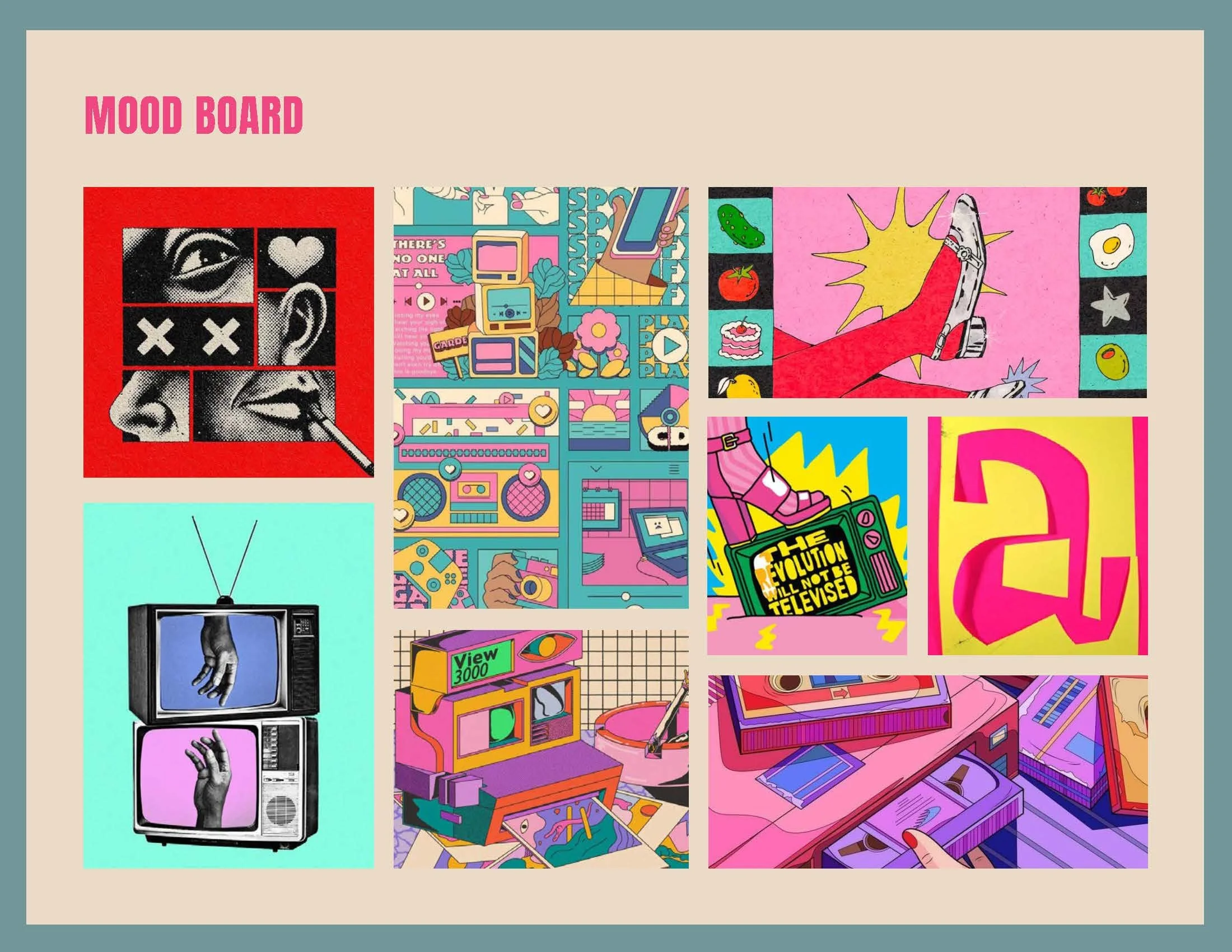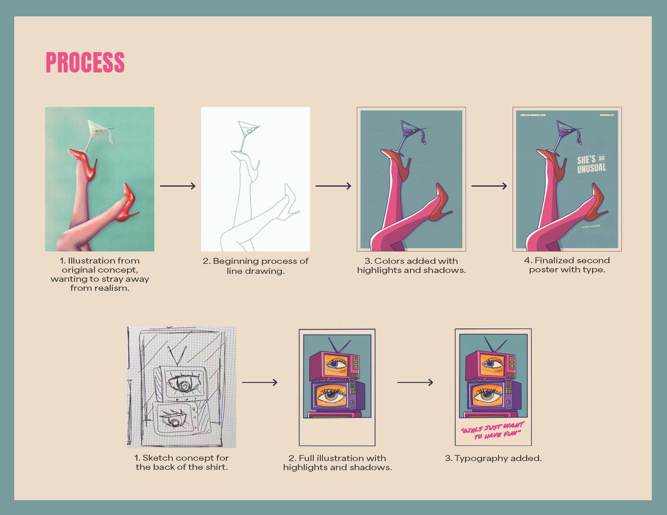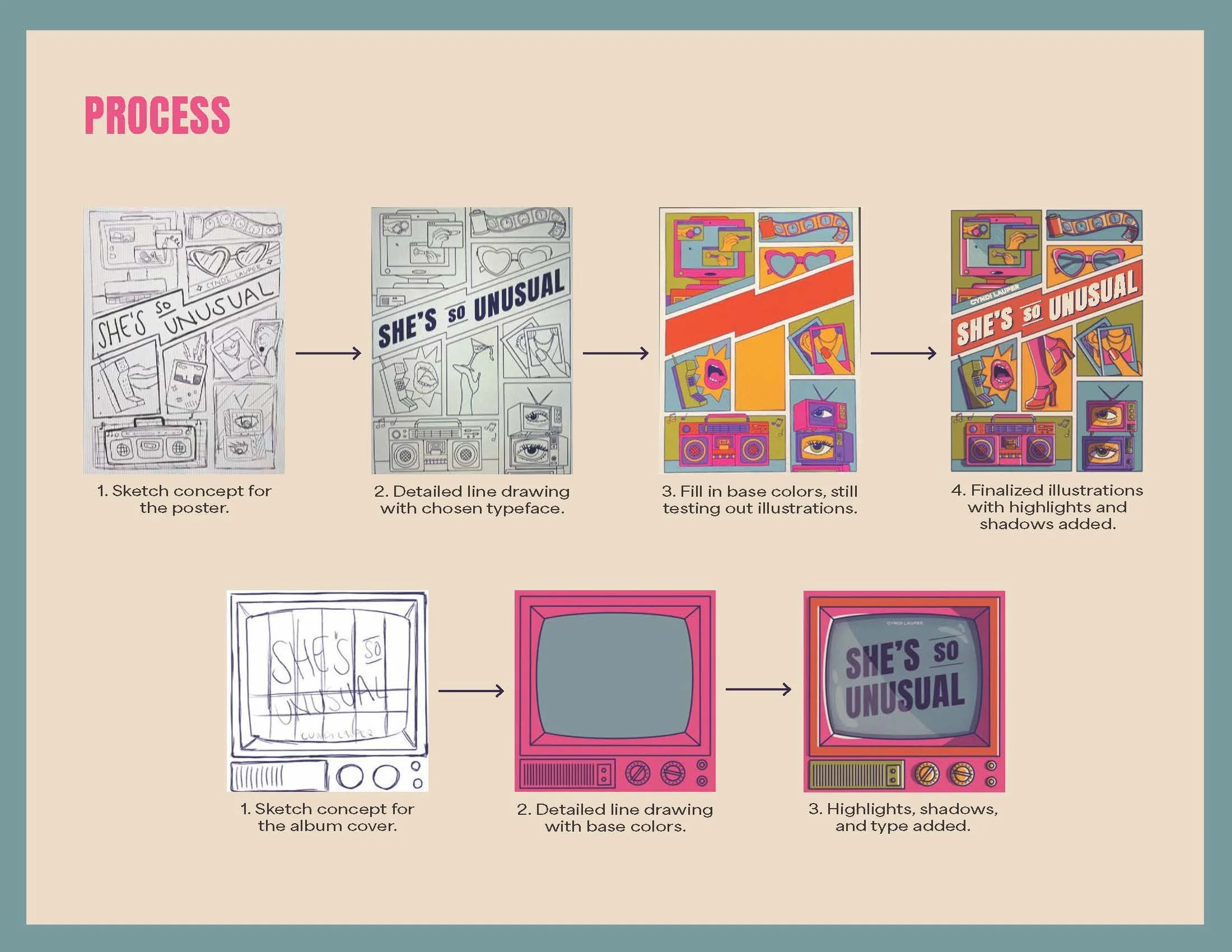 This project is an album cover design for Cyndi Lauper’s 1983 pop album She’s So Unusual. The album focuses on themes of women’s independence, freedom, and breaking of social norms. The vintage TV symbolizes how Lauper’s music challenges the way women are traditionally displayed in the media. My branding focus was to use vintage technology as a way for women to express their personalities or bodies through a lens of their choosing. Symbolizing women’s access to autonomy and ability to choose how they are perceived through factors like their personality, style, and bodies.