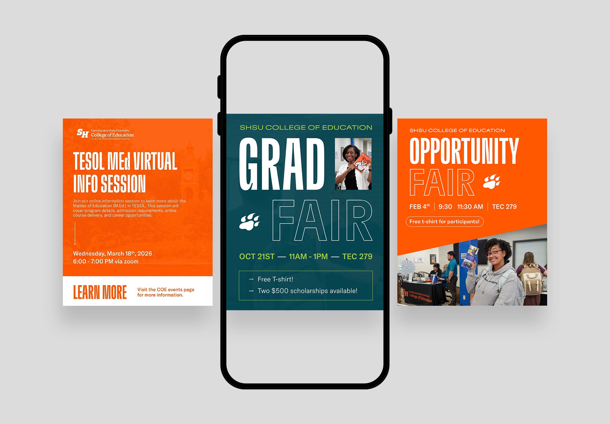This is a collection of works that I did while working at the Sam Houston State University College of Education. I became familiar with using the brand guidelines to keep the consistency of the university’s image. I was also able to complete projects that called for creative freedom so I could implement my own design style.